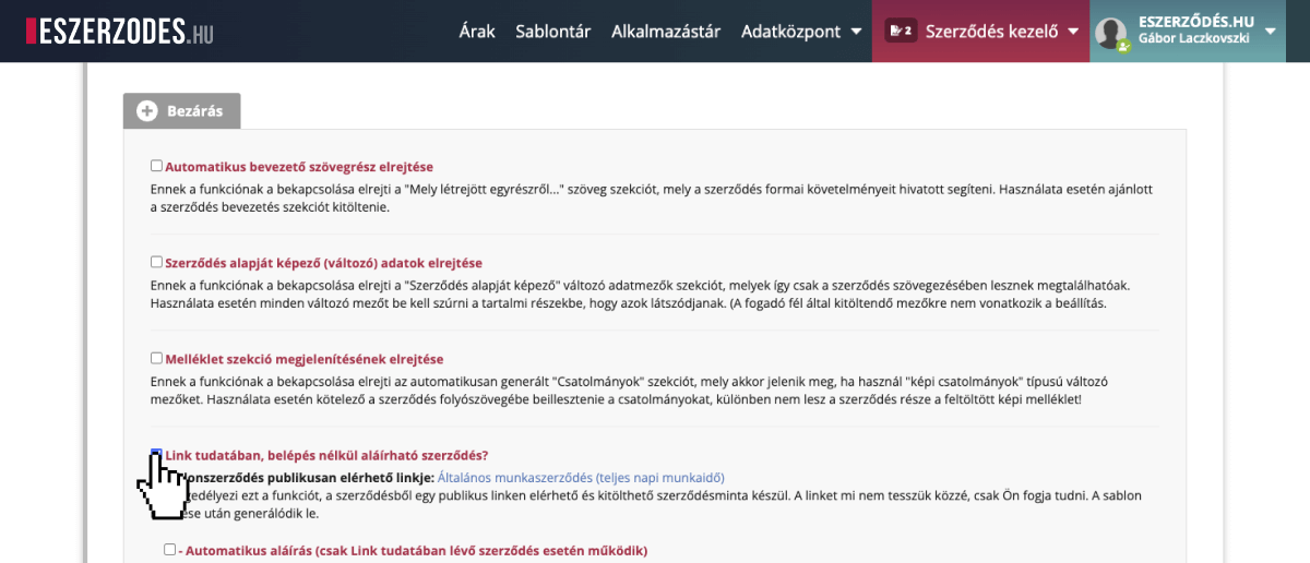 Link tudatában, belépés nélkül aláírható szerződés Publikus linket hoz létre a sablonból, amelyen keresztül belépés nélkül kitölthető és aláírható a dokumentum.